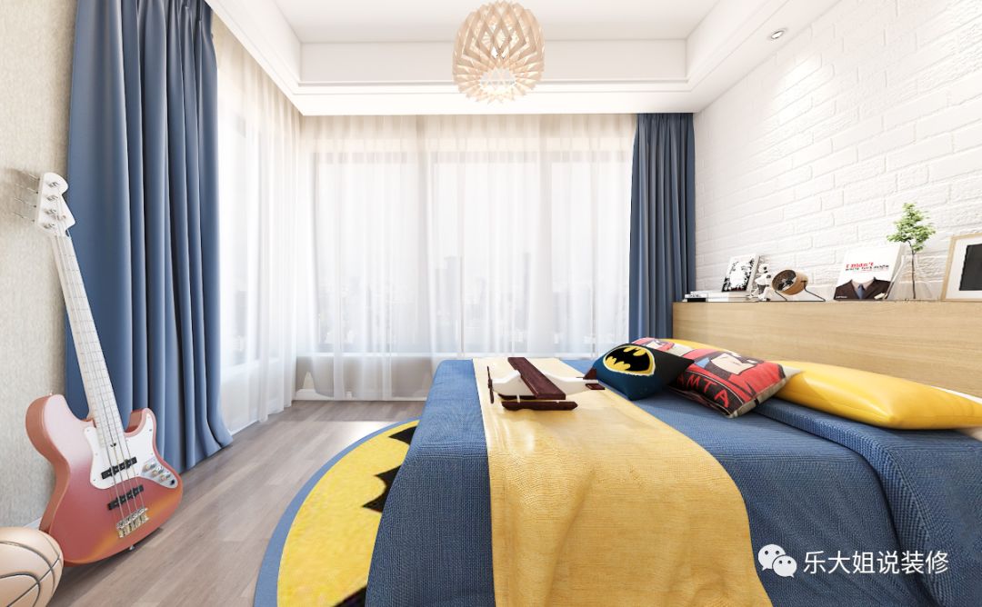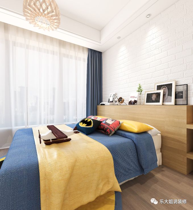 业主家有两个小男孩,乐大姐团队设计师将两个男孩房设计在同一个大套间内,以黄蓝色调为主,意在打造一个动静皆宜的空间。