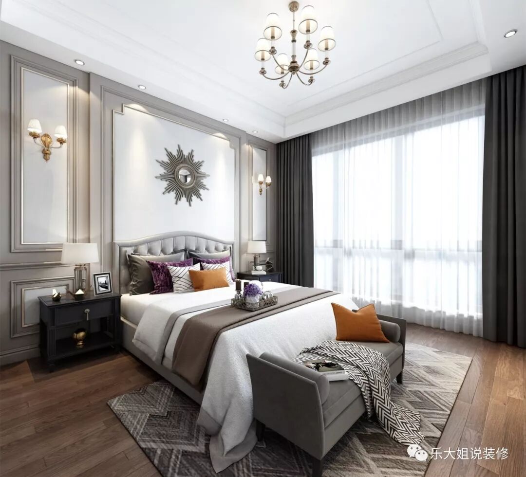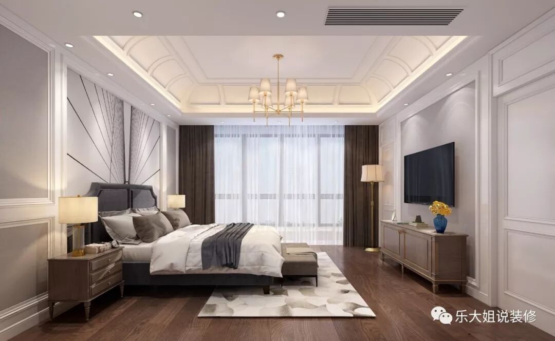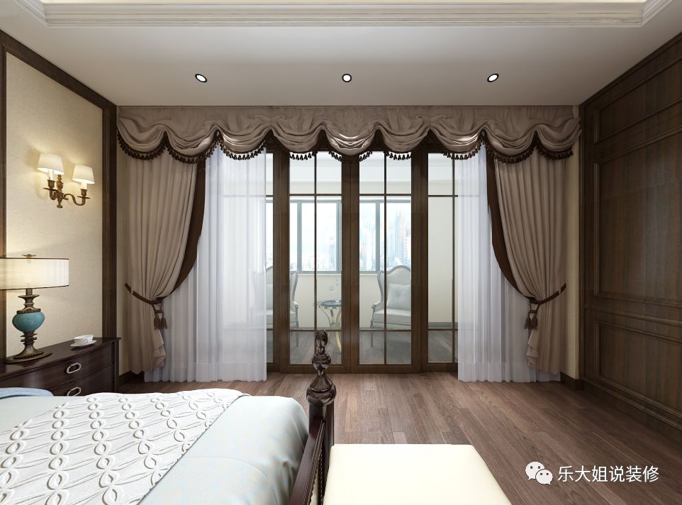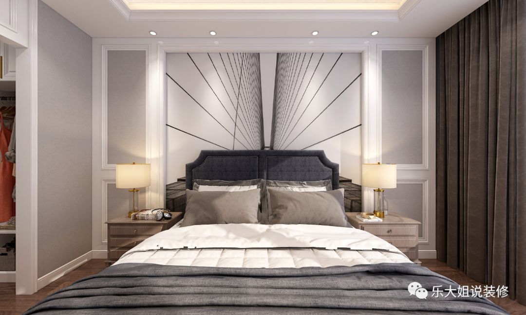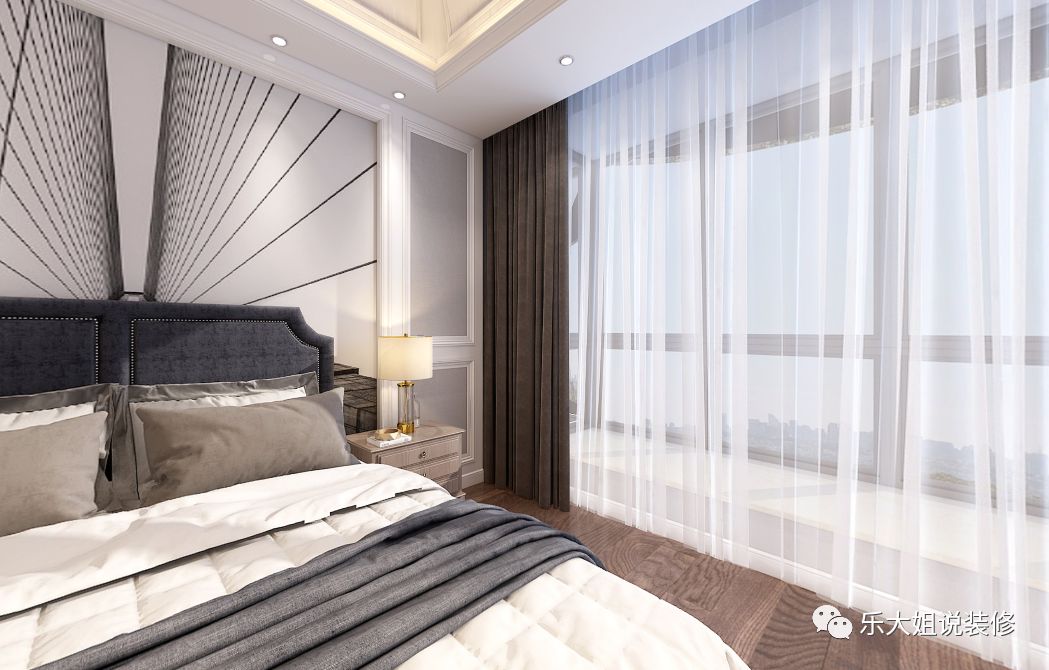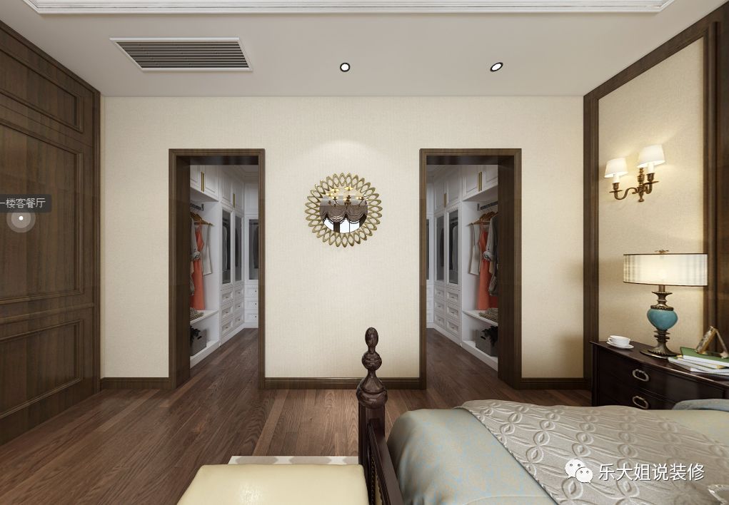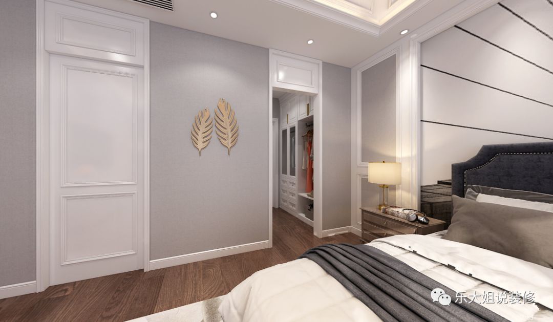 卧室与阳台之间采用推拉玻璃门设计设计,明亮通透,向暖而行;雅致悦目的色调,给人带来直抵心灵的舒适品质感。考虑到男女主人衣物较多,乐大姐团队设计师打破常规的设计,分别设置了男、女衣帽间以方便使用,将精致深入到每一个细节。