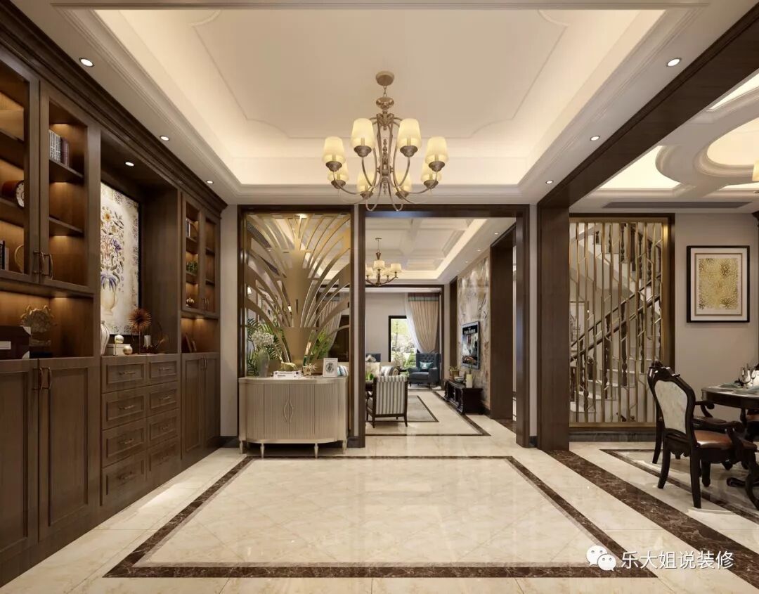 乐大姐团队设计师把玄关的作用极致化,金属栅栏式隔断,像极了显露与深藏的爱。深沉内敛的棕木色展示柜,让美式风格淋漓尽致,美观性和实用性并存,配以金属色的置物柜,增添了不少的格调。