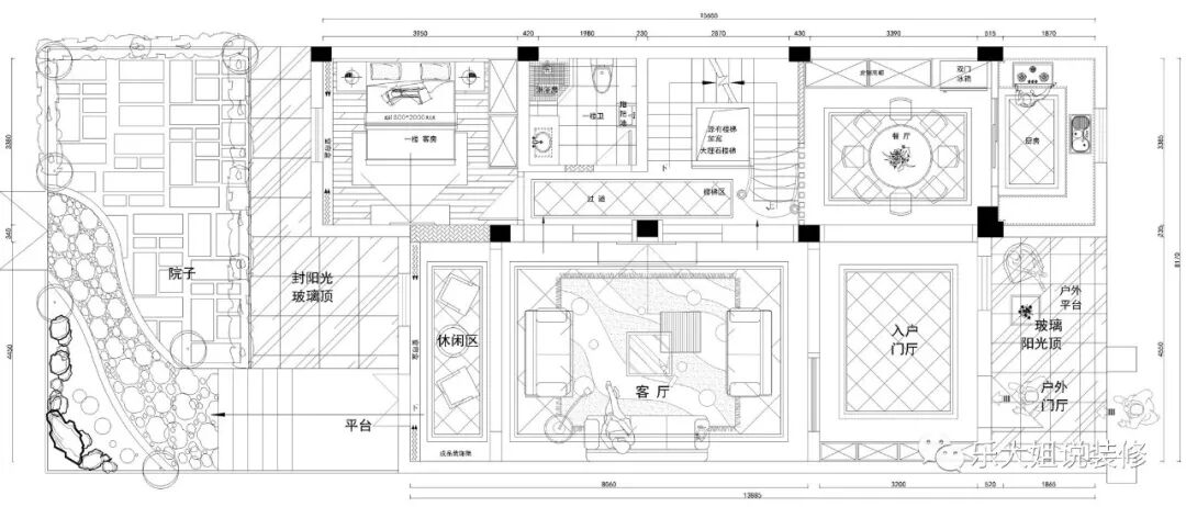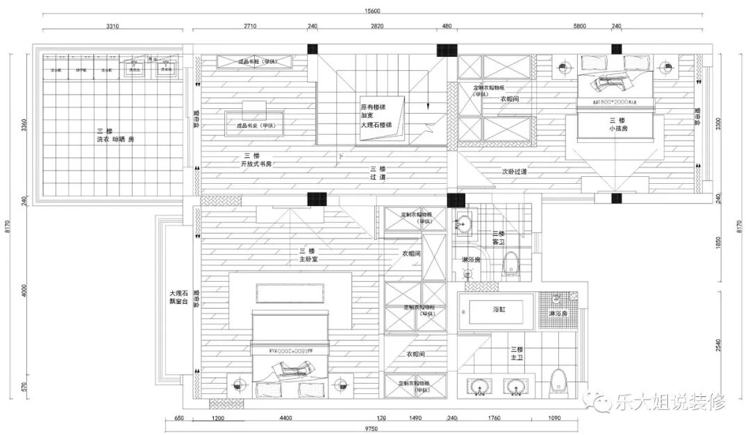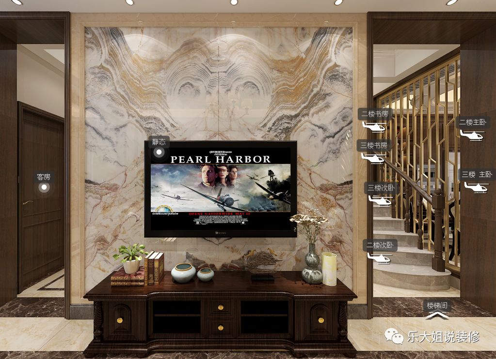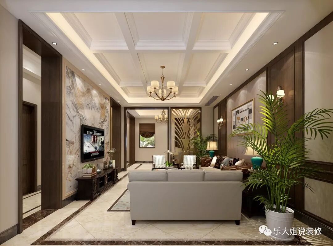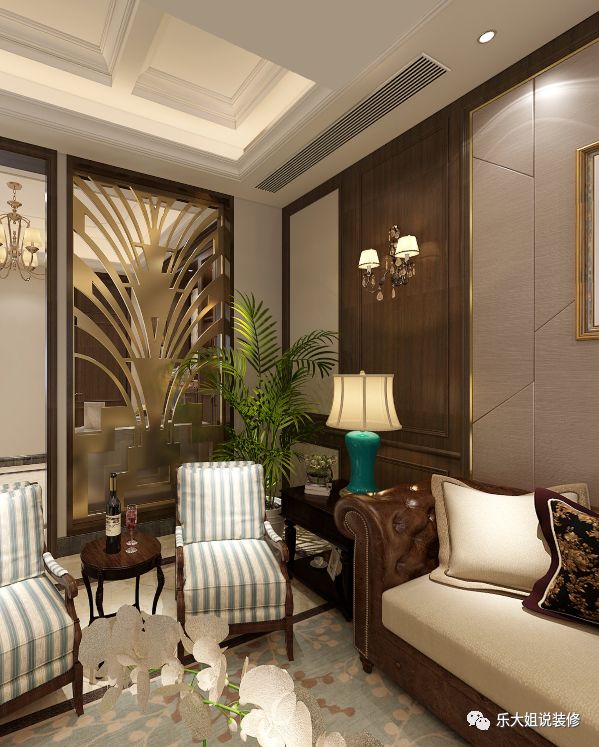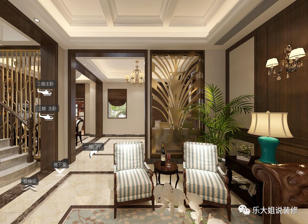- 乐大姐团队设计师根据业主的需求规划整体空间布局,空间功能齐全,包括会客区、客厅、餐厅、厨房、卧室、书房等,把每一个空间都利用得淋漓尽致;