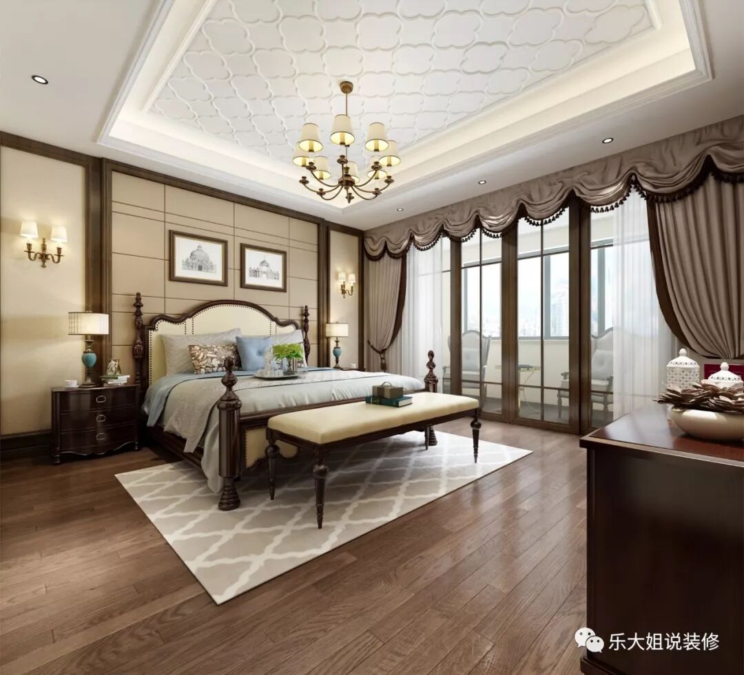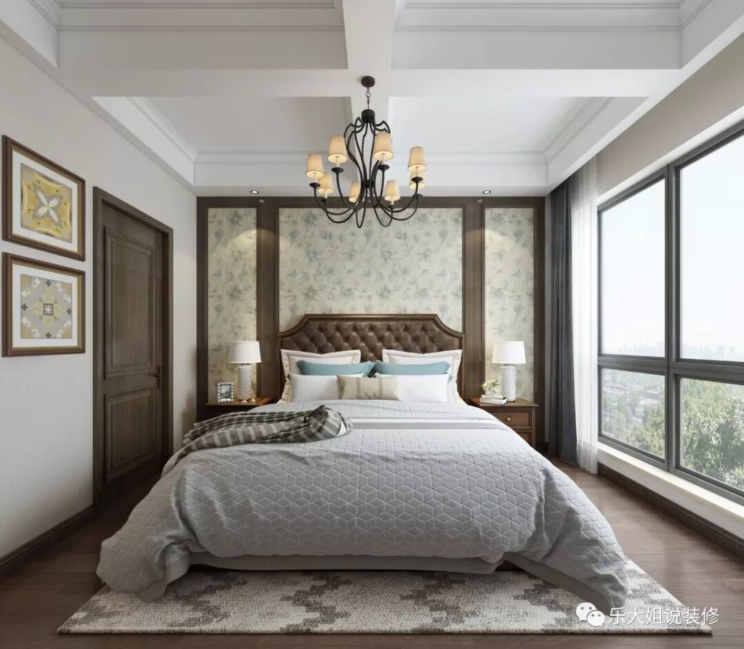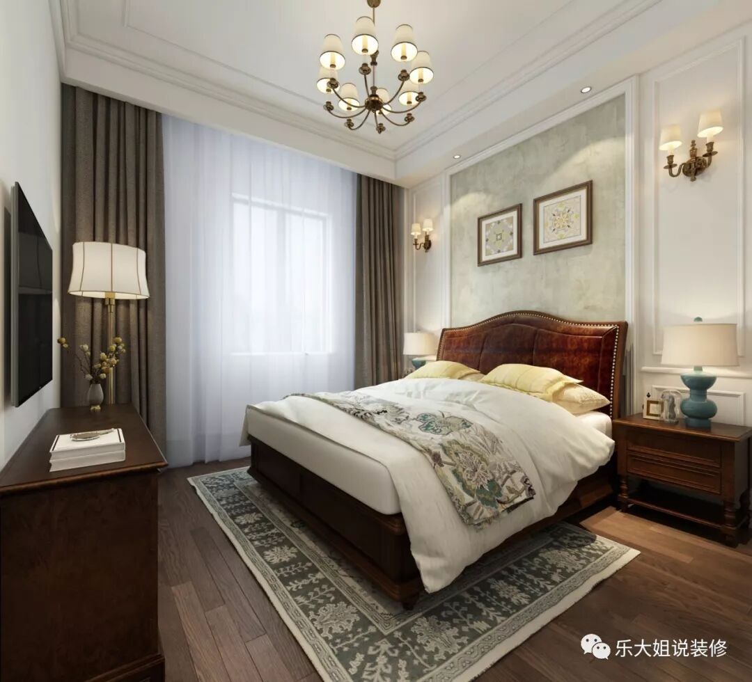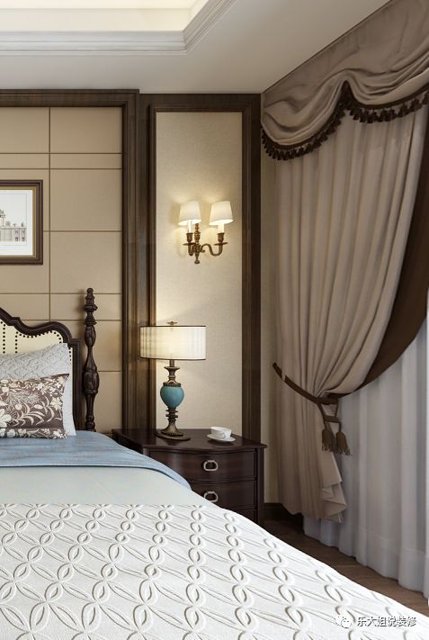 在卧室的设计上,温润沉稳的木制家具彰显着细腻与典雅,并通过精致的灯饰提升空间的格调,以床为视觉中心,米色的护墙板为背景,营造了整个空间温馨的古典气质,丰富空间的视觉性。