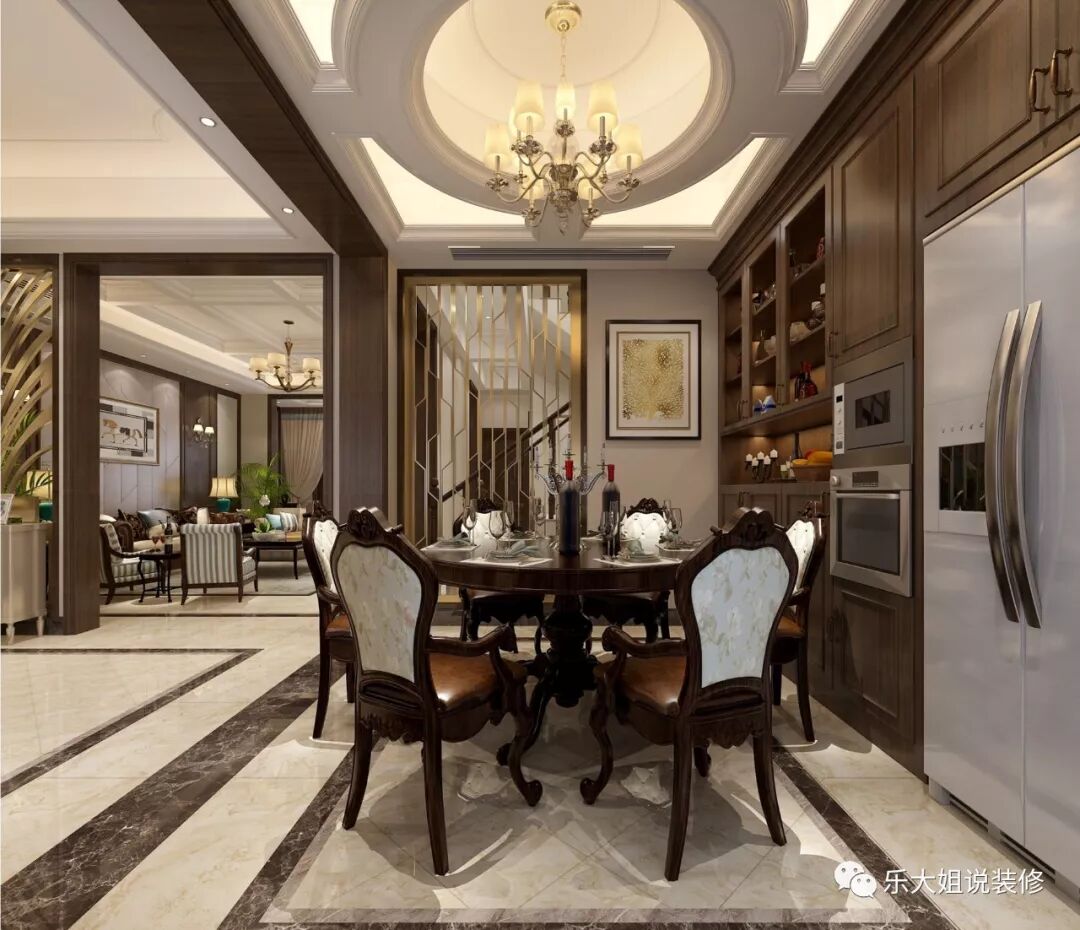 暖阳与和风,红酒与笑容,以及四季与爱。最美的风景不过如此,古典与浪漫的结合。圆形吊顶和圆形餐桌上下呼应,餐边柜旁的古典的挂画,和美式的浪漫气息融为一体,打造娴静优美的用餐环境。