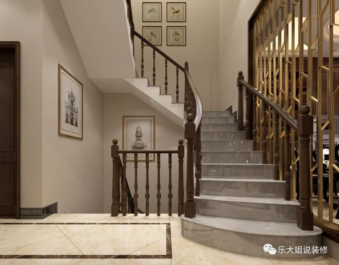 楼层空间的差落有致,区分了开放及私密空间,拾阶而上,大理石台阶、棕色木质扶手、盎然有趣的挂画延续了一楼非凡的质感。