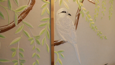 卧室的背景墙采用的是垂柳叶屏风式样的层次点缀,即贴合新中式的设计风格,也为空间注入了自然气息。拉丝黄铜的质感沙发床,注入了些微的时代感,巧妙的处理了当代元素与东方意境的关系。