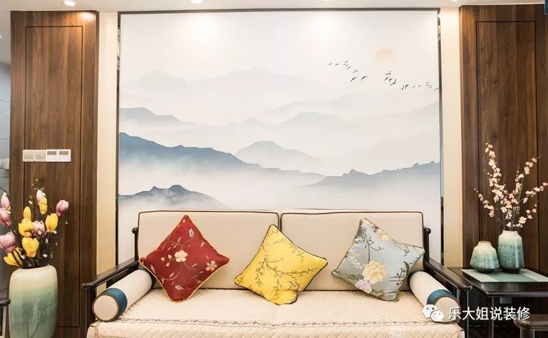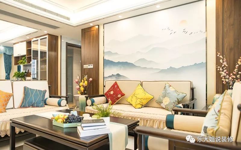 客厅古典的木质家具融合现代沙发,理性却不失温度,旭日东升的背景墙让整体充满诗情画意。空间装饰多采用简洁硬朗的直线条,直线装饰在空间中的使用,更有一种内敛、质朴的设计风格,使整体设计更加实用、更富现代感。