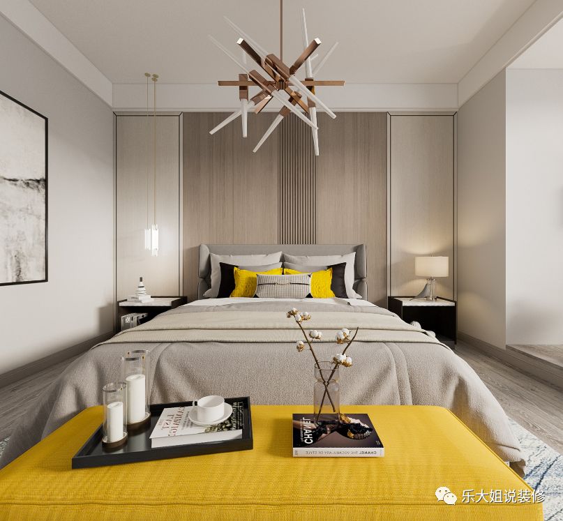 次卧室同样保持着整体的风格,灰色是主色调,搭配麻灰色的床品和姜黄色的抱枕床前凳,低调中透着明快。