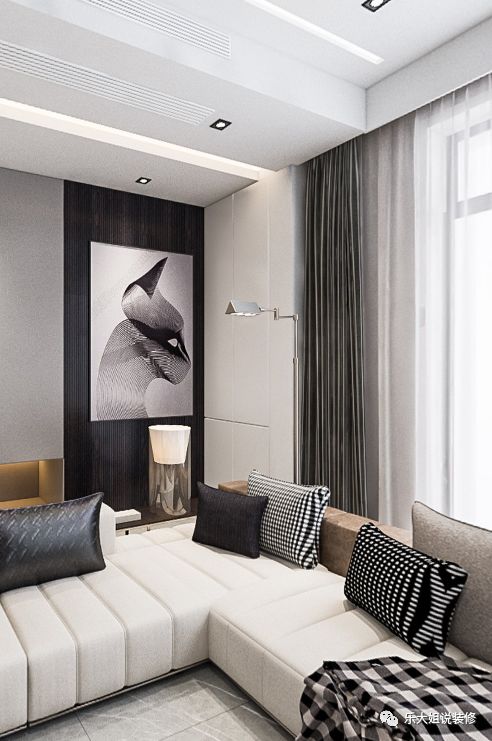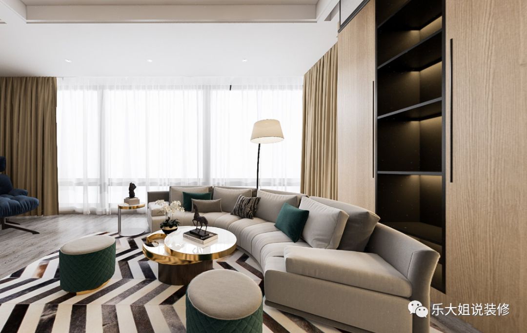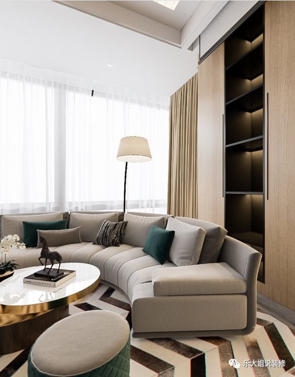 客厅是业主待客休闲的空间,乐大姐团队设计师基于黄金分割线上的布局、留白、比例、虚实,看似随意,却拿捏到位,取舍精准,以高超的设计手法使得空间灵动而有序,用最简练的方式传达了主人的个人品味和会客状态。