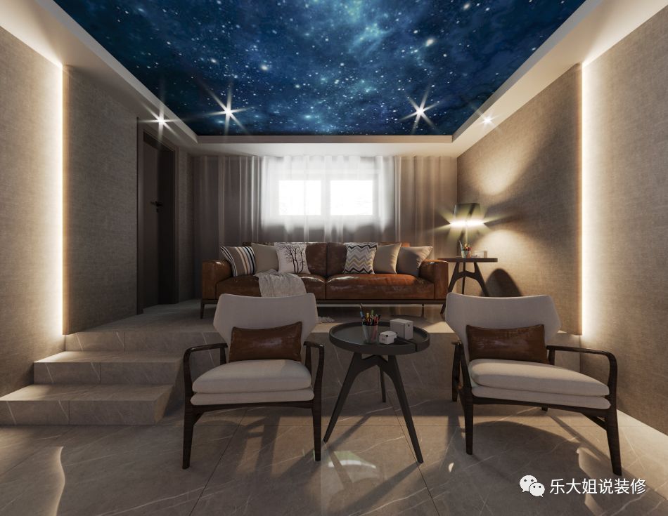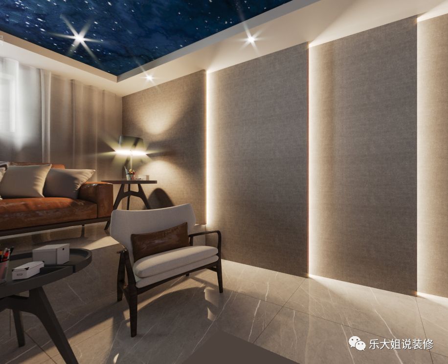 影音室宛如魔幻黑盒子,顶面参考星空的感觉来设计灯光的层次,立面则选用灯光和递进式立面,格调静谧,氛围十足。