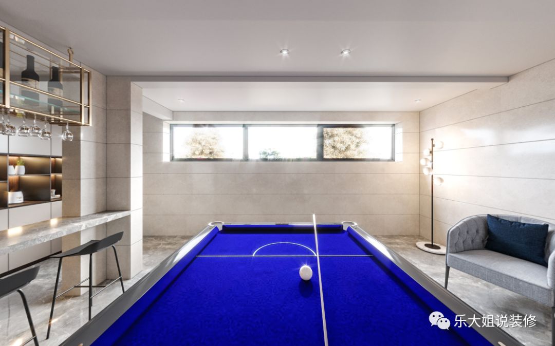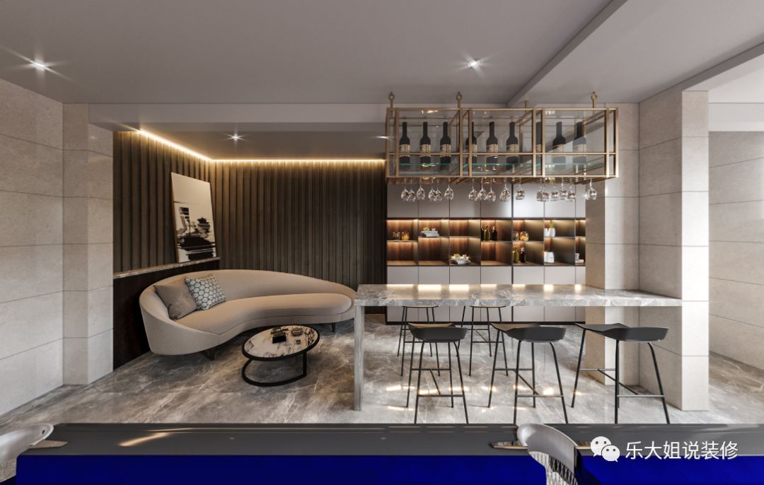 地下一层为休闲娱乐空间,品酒区、台球室、影音室一应俱全,满足业主多元化的功能需求。台球室与品酒区一体而成,经由俊朗的材质强调线条垂直感以及映射延展性,塑造出丰富的立体构成。