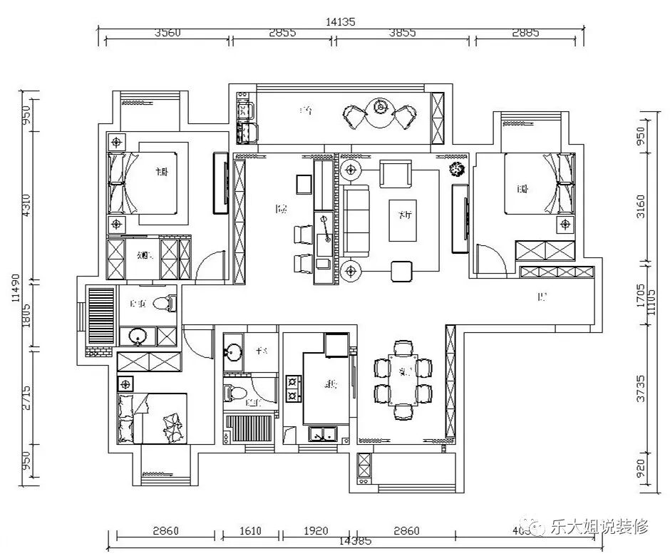 本案户型是四房两厅两卫双阳台,户型方正,采光充足,空间上不需要做太大的改动;