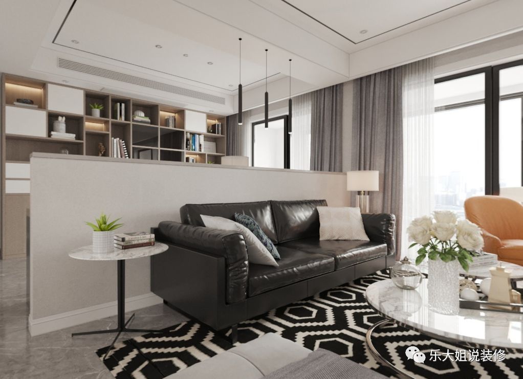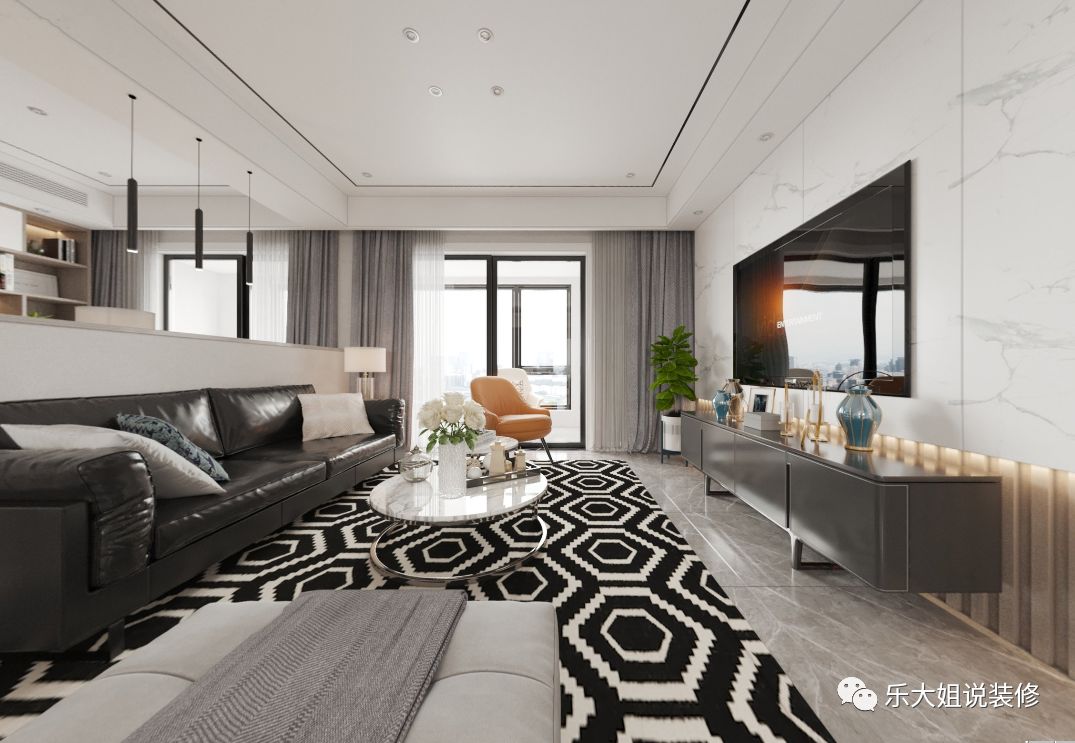 设计中局部黑白灰色调的运用,产生强烈对比,把克制地情绪表现得额淋漓尽致。黑色皮质沙发,安静站立在渐变的几何形状同色系地毯上,爵士白大理石墙面贯穿整个电视背景墙,空间中的静谧感被无声唤醒,所谓含蓄,不过如此。