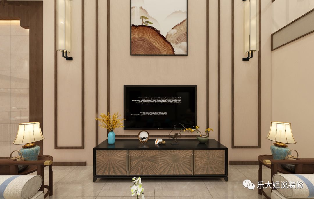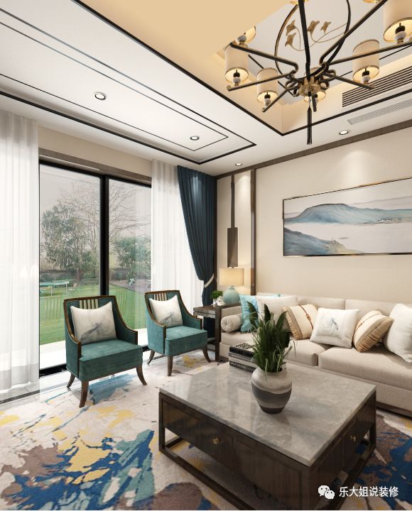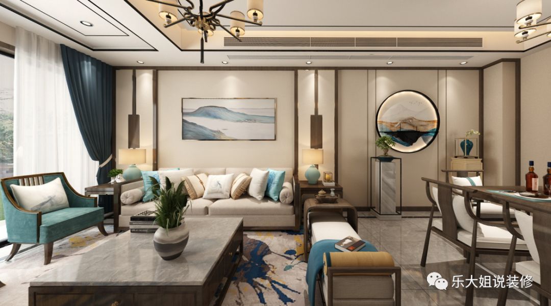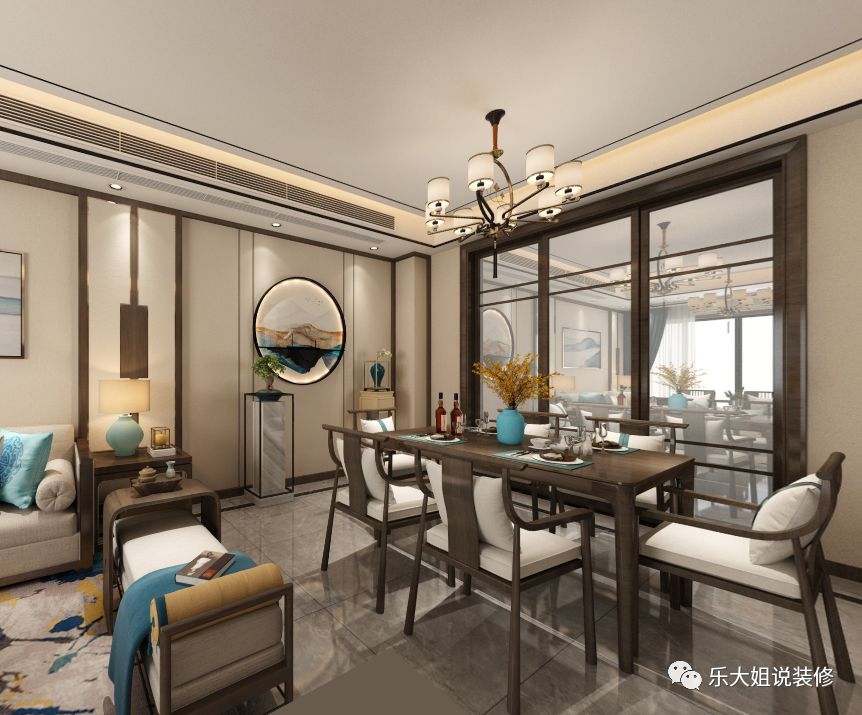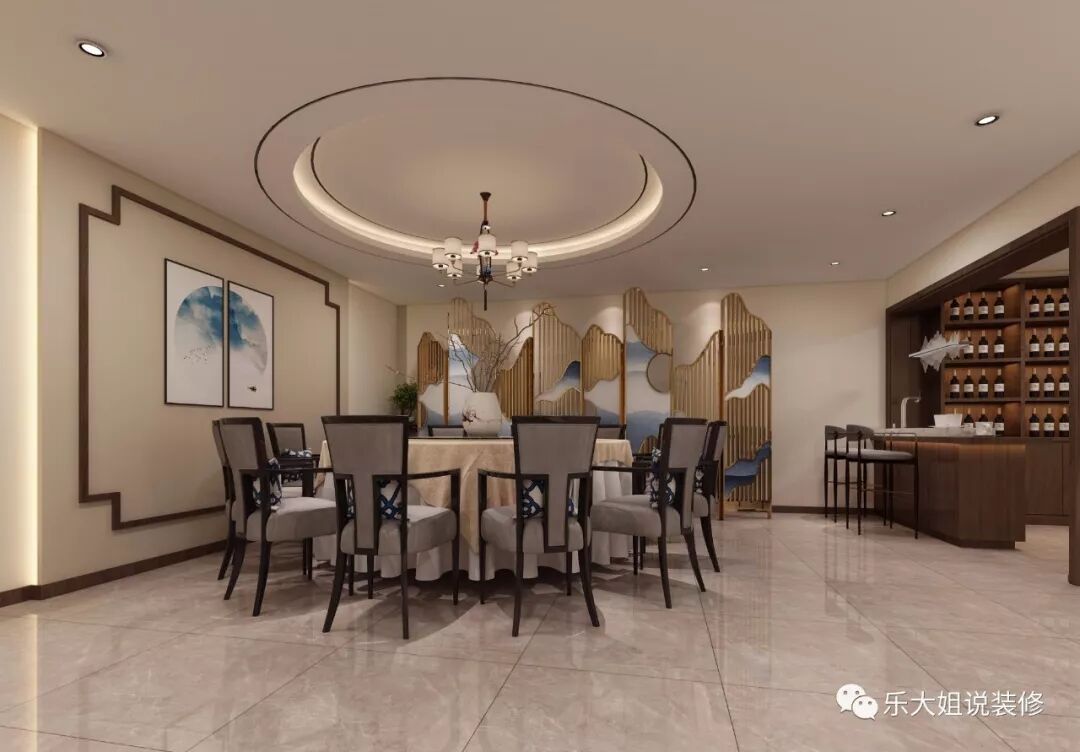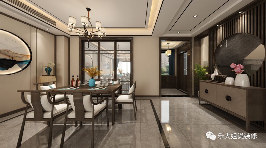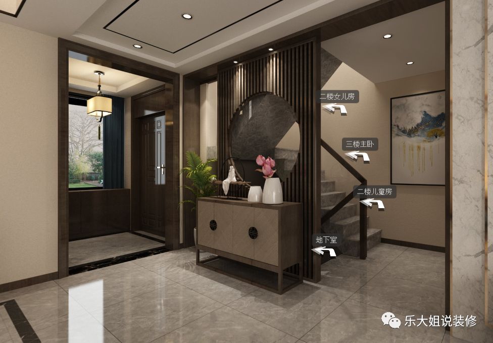 关于风格,因为小区整体风格定位就是中式园林式,配套园林景观做的很到位,所以业主想要内外呼应,享受远离城市喧嚣的闲适逍遥。根据业主的需求,乐大姐团队设计师前期和业主前期有考虑过红木家具,但红木虽庄重但难免缺失时尚感。故而后来选择了偏温馨时尚的新中式,这样家里的小朋友也喜欢。功能上,此套案例,地下室面积比较大,与业主热情好客性格特征相碰撞,激起丰富的宴客空间。