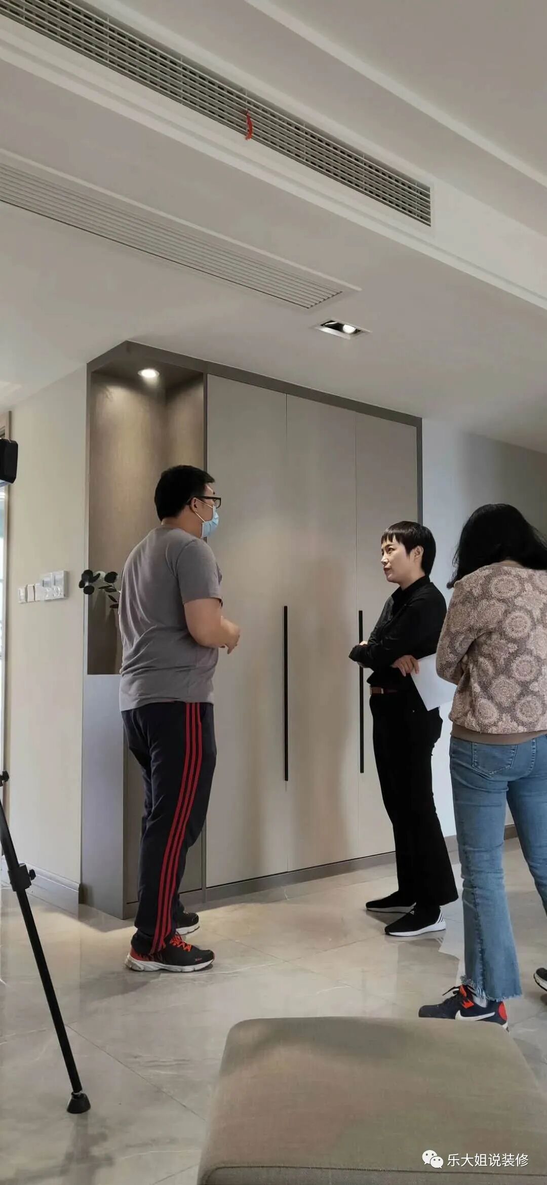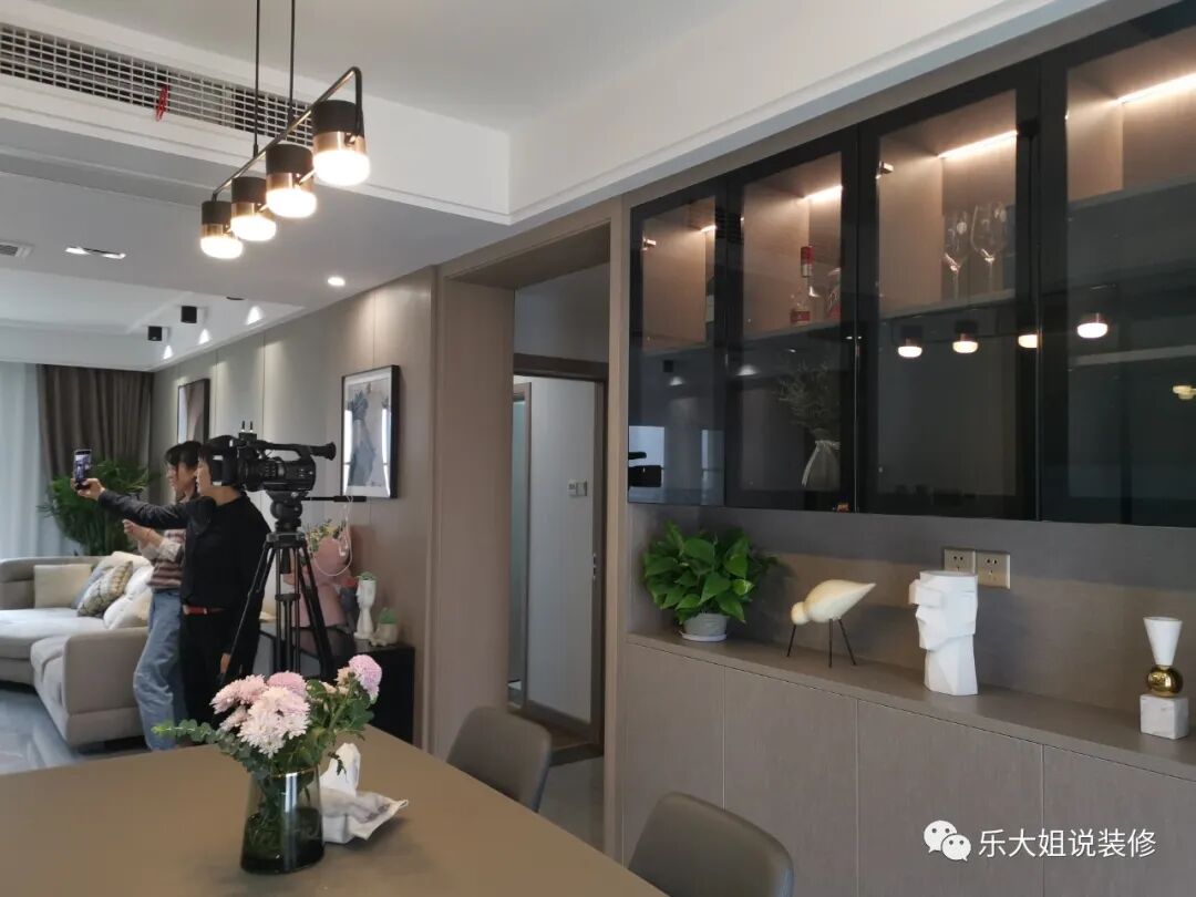 本案位于吴江松陵,业主彭先生买这套房子主要是用于与朋友聚会。业主平时都是住在市区的,女儿则长期在国外,所以房子的使用频率和使用人口都很少。对于房子的期许,业主一家三口希望每次回到这里是一种完全放松的状态,不喜欢繁琐装饰的堆砌,“家,简单舒适就好”,但同时也不希望材质上过于单调。▲ 乐大姐正在拍摄苏州电视台《第一时间》解析样板房装修知识点