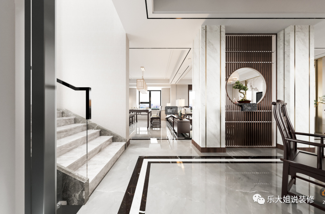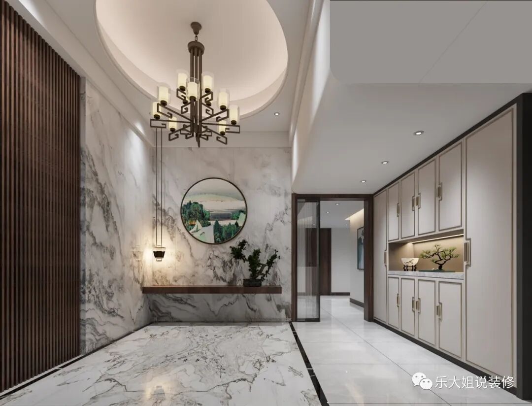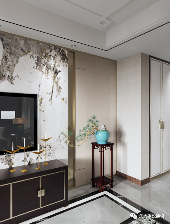 门厅中大理石墙面凸显着山的刚劲,挂画与绿植昭示着水的柔情,不同材质深刻地表达着山与水的意境,在收放有致、虚实结合之间。