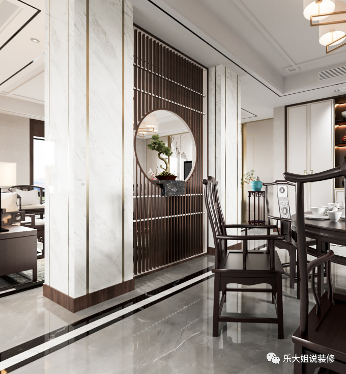 原始户型中客餐厅之间有一根构造柱是无法拆除的,考虑到美观性和本案的中式风格,设计师人为地加了一根构造柱;