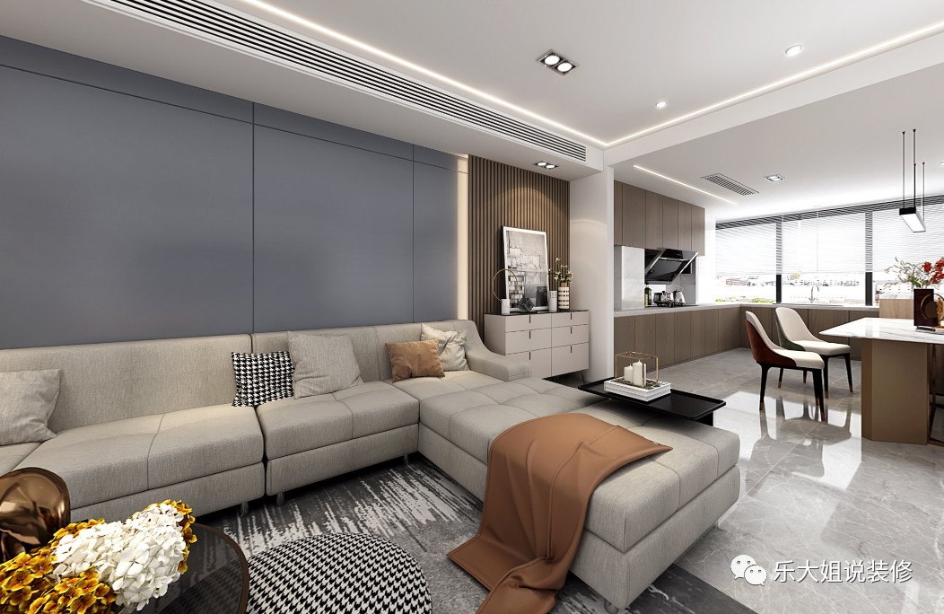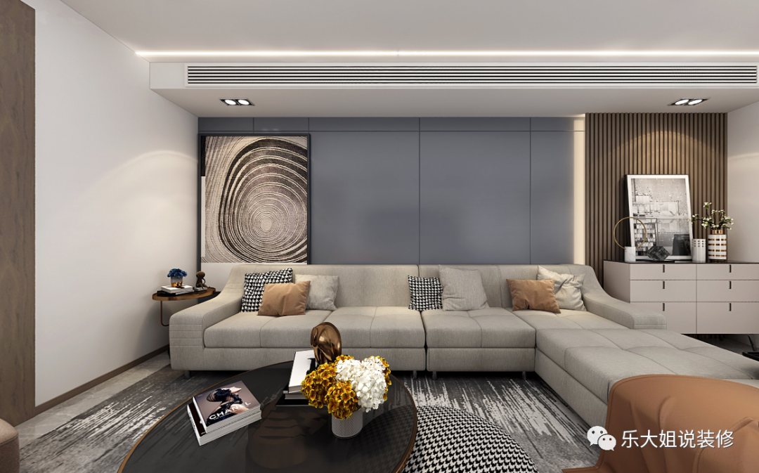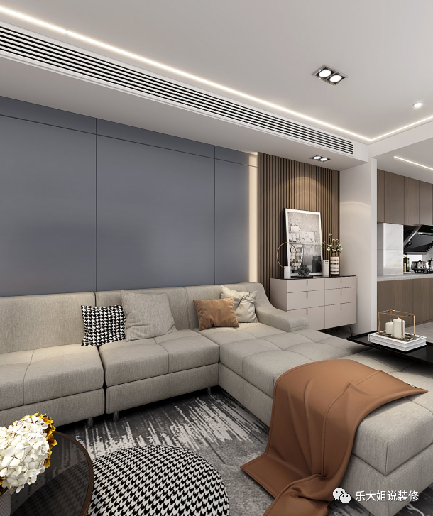 客厅区域中央空调常规的做法是采取下出下回的做法,但因本案的客厅沙发区域跨度很长,以致于做中央空调会有很长的回风口在头顶,既不美观又会出现冷凝水下落的情况。所以,设计师采用侧出侧回的设计,这样既增加了美观,又不会出现冷凝水的下落问题,且因沙发背景墙足够长,制冷制暖效果也不必担心;