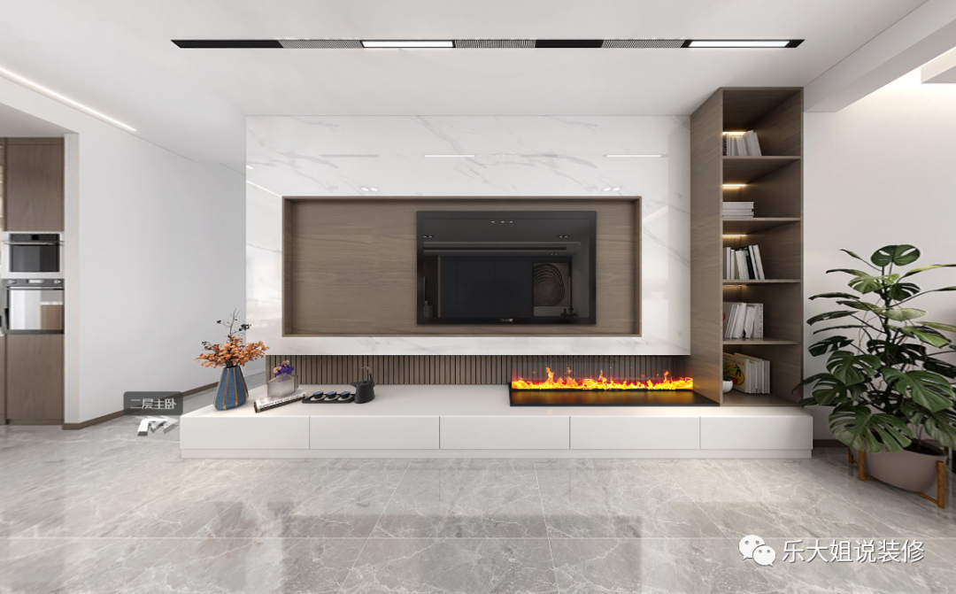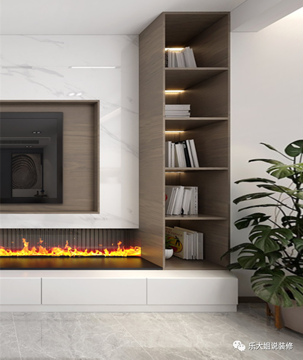 客厅的焦点是内嵌式的电视背景墙,电子壁炉+岩板+原木色的饰面板三种材质的拼接设计,带有一种与生俱来的气场,不经意间撩拨着所有人的眼球,将时尚高雅的姿态充分表达,创造更高品质的生活体验。