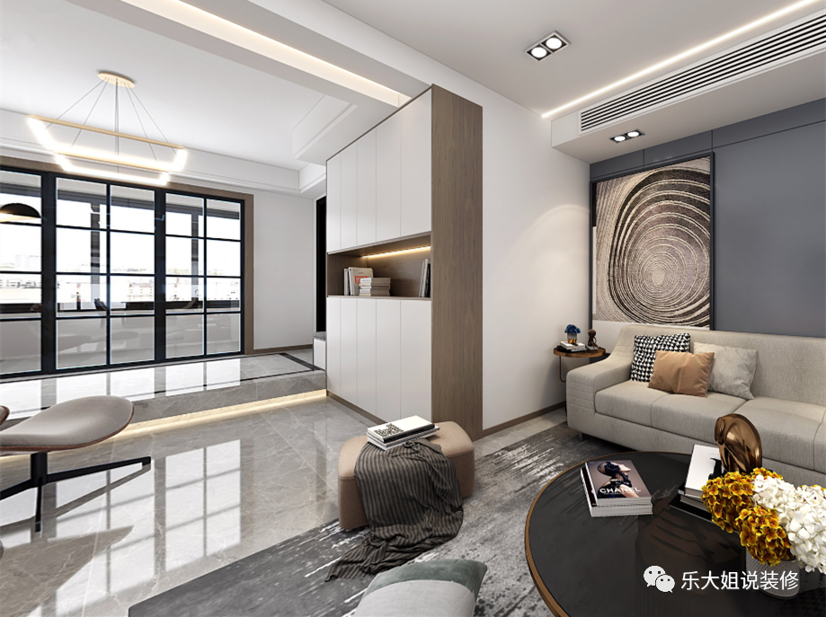 原始户型中进户的地面跟客厅地面之间(即改造后的生活阳台与客厅活动区域)有二十几公分的落差,由于是结构平台无法改动,所以乐大姐团队设计师采用了大理石下挂的灯槽设计,这样不仅视觉上不会显得突兀,而且晚上进出门都有灯光的衬托,也增加了安全性;