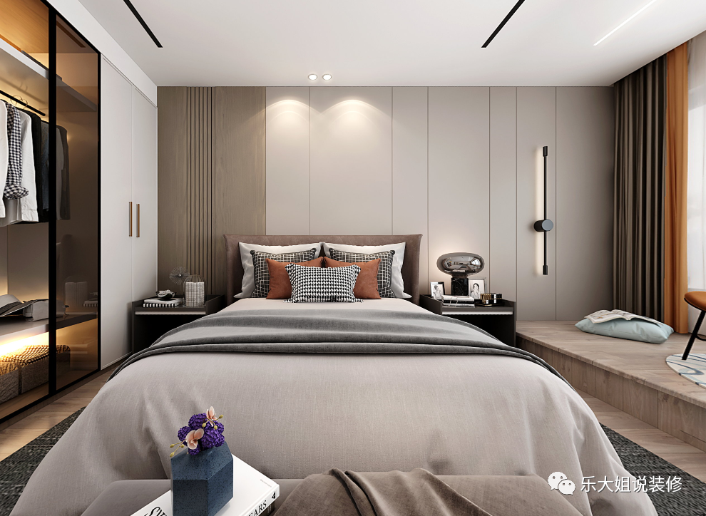 一楼主卧是为业主夫妻两养老准备的,将简约与高级化身为一种低调的奢华,平静不失深刻,让卧室历久弥新。