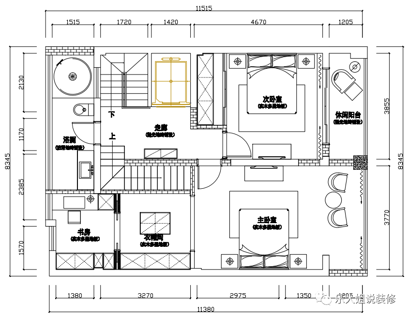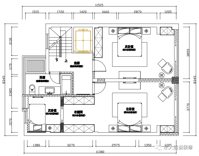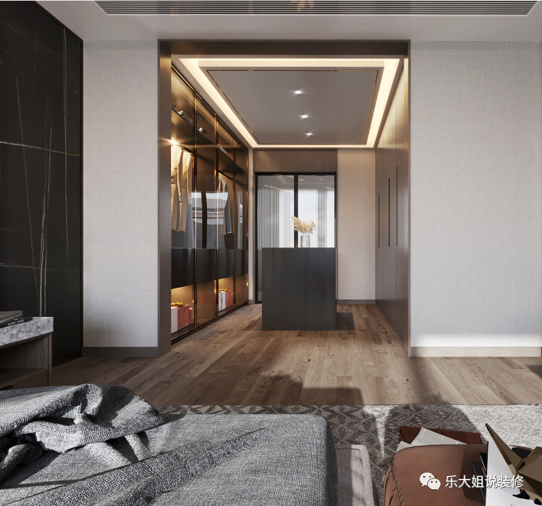 二楼卧室是业主夫妻两的睡眠之所,所以乐大姐团队设计师将南北房间和中间的过道全部作为卧室部分,以增加整体的空间感。另外,考虑到采光问题,衣帽间采用敞开式的设计。