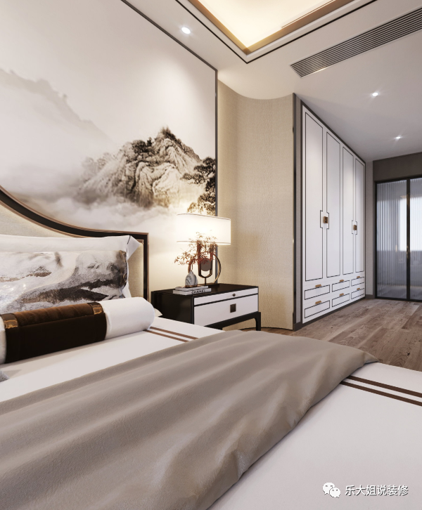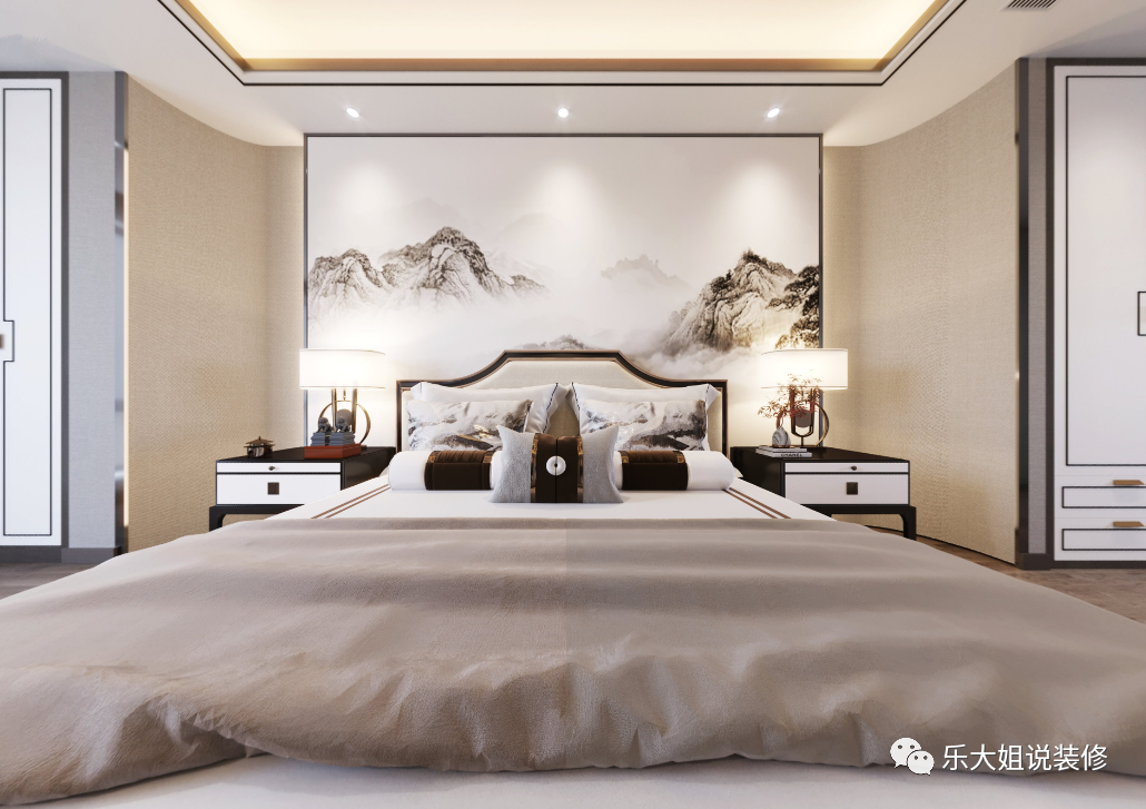 考量充分的美学性,细微的闲情逸趣被写入床头内,以自然大气的米白色作为底色,清雅山水画卷背景调和其中,清隽别致间,渲染大隐于市的栖居生活。