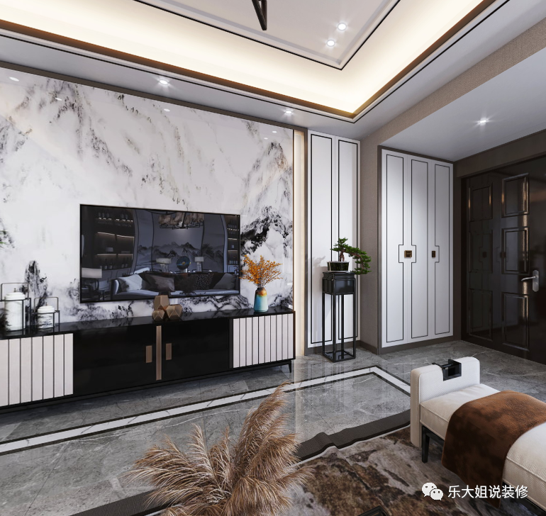 玄关是整个空间至关重要的部分,主人宾客由此进入,这里也是“净化”感官的第一线。设计师巧妙地利用进户门正对的那一堵墙,在其上用大理石材质制作了一个浓郁有致的内嵌式山水画,进门即见山见水,不仅加强了空间感,也让人不自觉心静神定,闲适安逸下来。