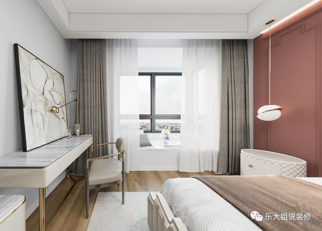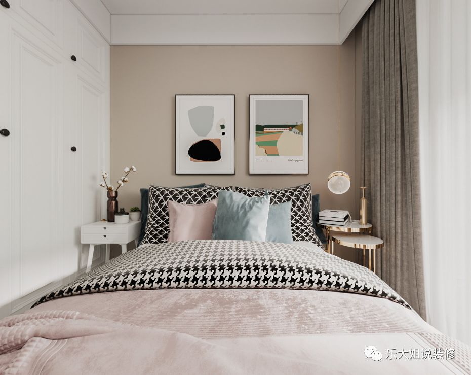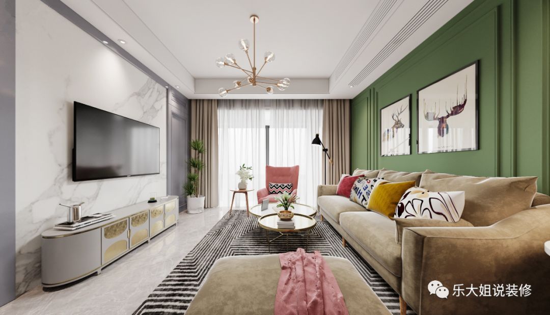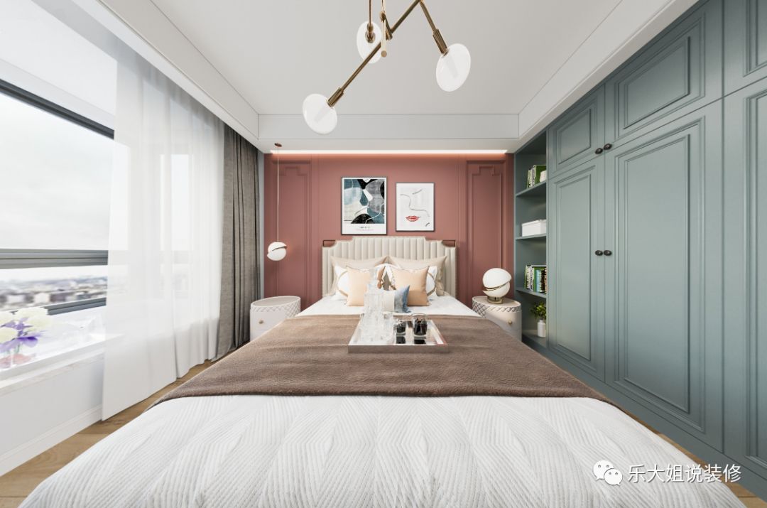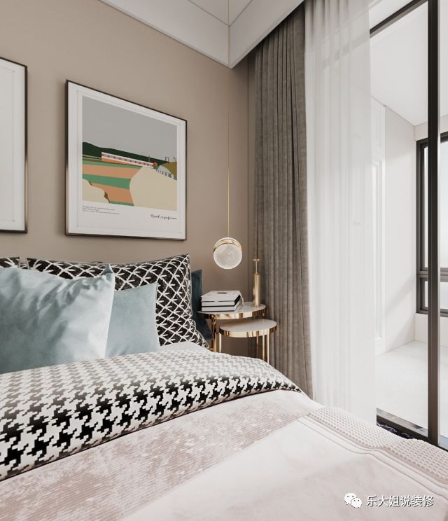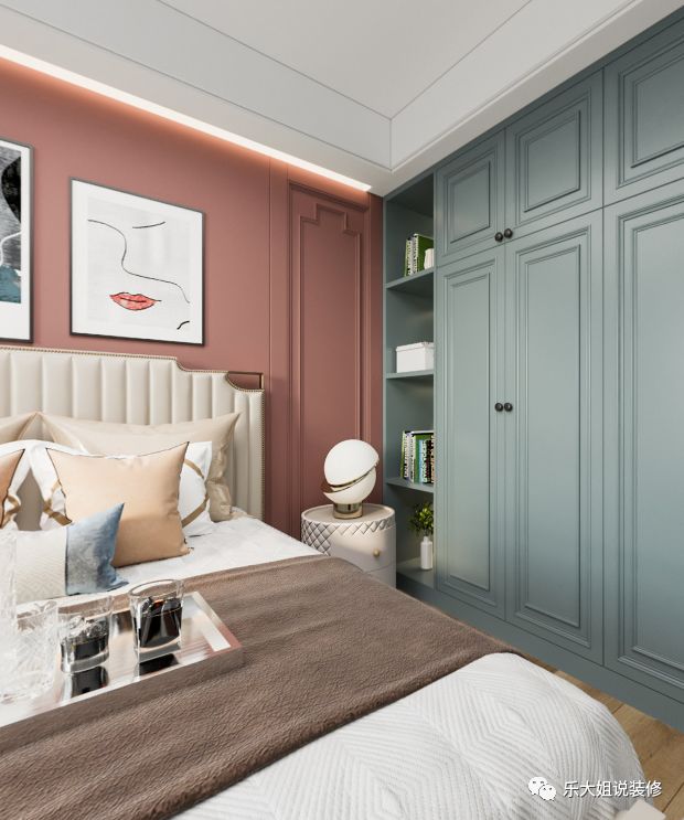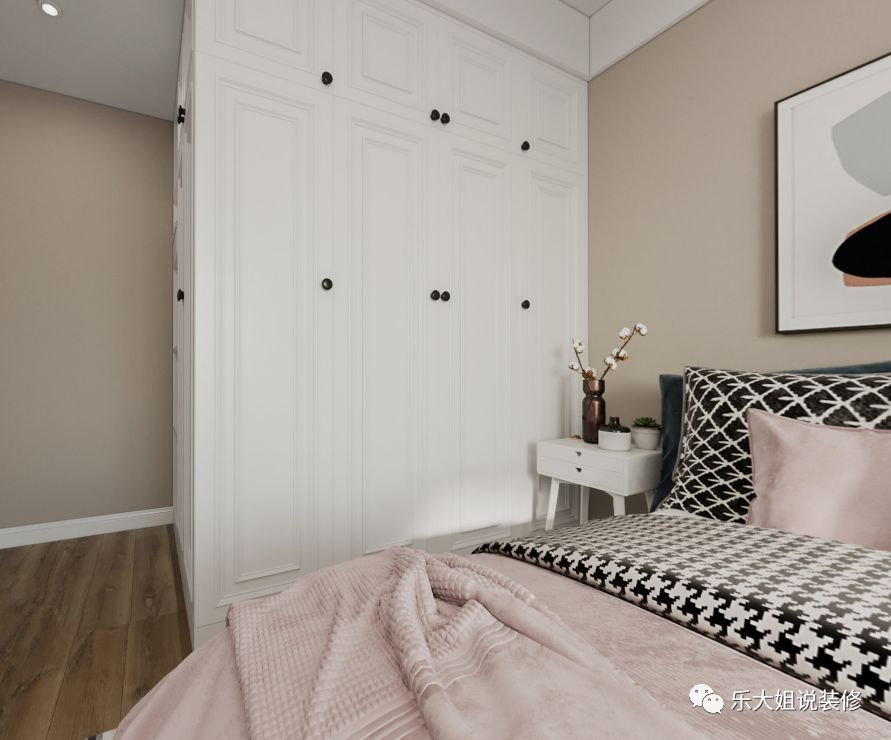 考虑到客厅电视背景墙的整体性及次卧的私密性,乐大姐团队设计师将次卧的门做成隐形门整个融入到电视背景墙上,从而使得电视背景墙美观而又大气;