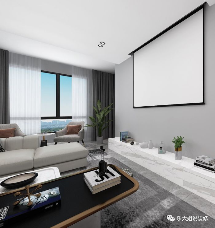 男主人钟爱电子产品,电视背景选择投影仪+固定幕布,打造出绝佳的影音效果,每天都像是在看电影,一家四口坐在一起,要多温馨有多温馨,同时也解放了部分的客厅空间。