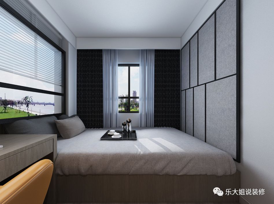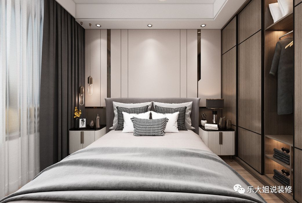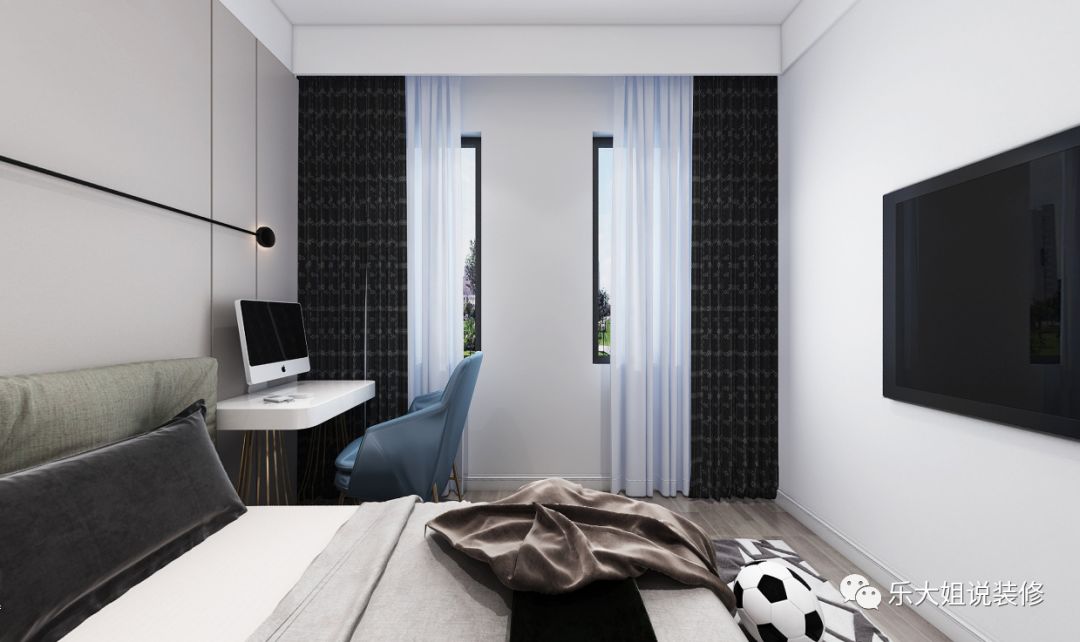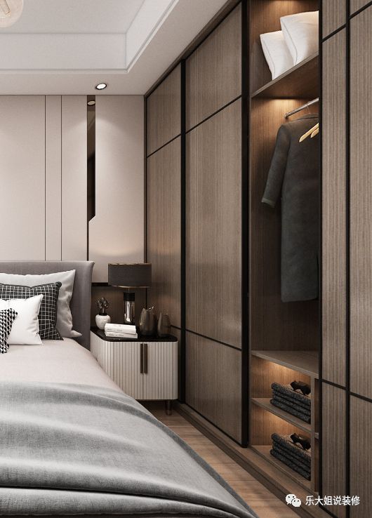 主卧采光充足,温润内敛的灰白色和木饰面,让整个环境变得浪漫轻柔,构造了一个静谧、安然、舒适的睡眠空间;一日的思绪飘飞,天马行空的心力交瘁,好像都能沉淀到这份淡然的灰色中,梦里无忧,岁月无扰。
