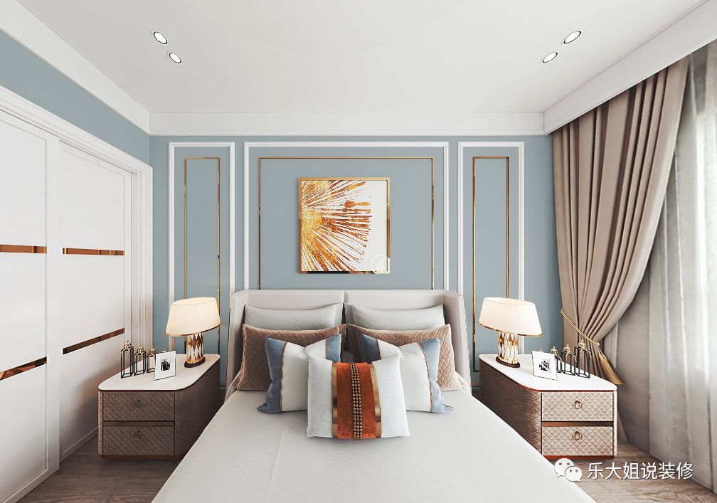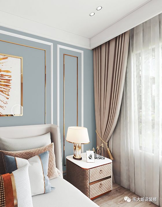 次卧简洁又不失格调,低饱和度的色彩搭配出极度舒适的视觉效果。设计师用石膏线和金属走边让背景墙更立体,提升卧室空间的整体质感,打造温暖宜居的睡眠空间。