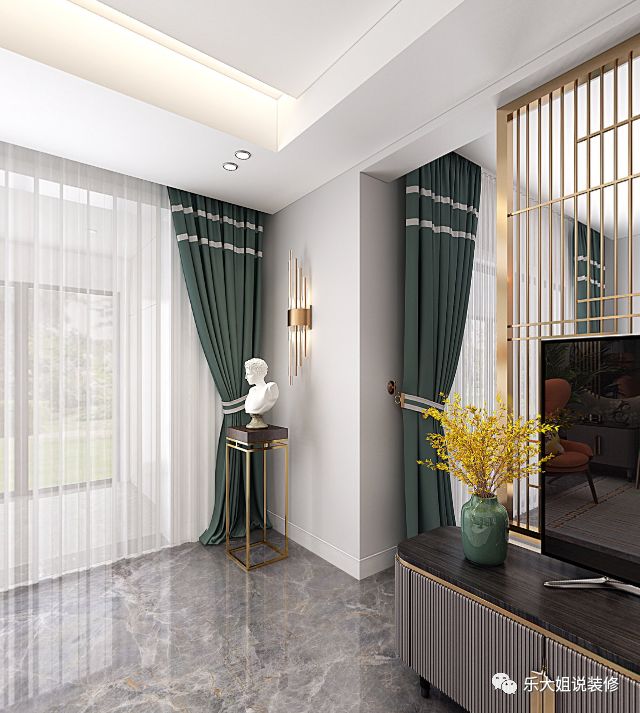 软装陈设为家带去独特的调性。柔和的阳光透过窗户,散满整间屋子,白色和绿色两层窗帘的设计细节,满足了对客厅不同采光的需求,且与客厅整体色调相呼应。定制整体柜,让客厅收纳空间最大化,辅光源的运用,使客厅呈现更好的光泽感。