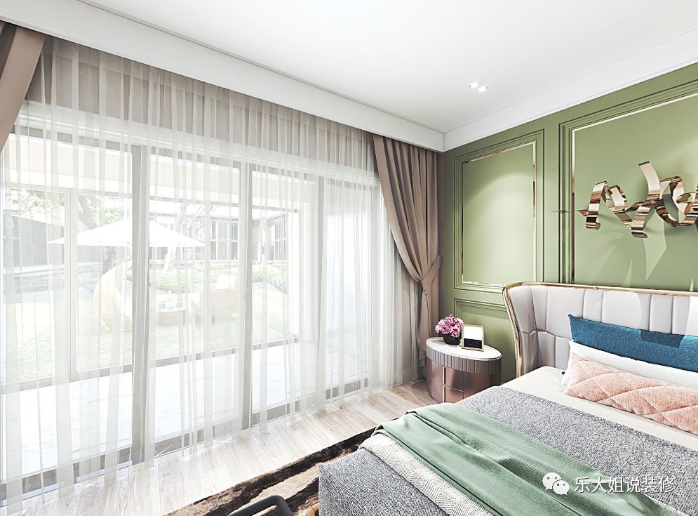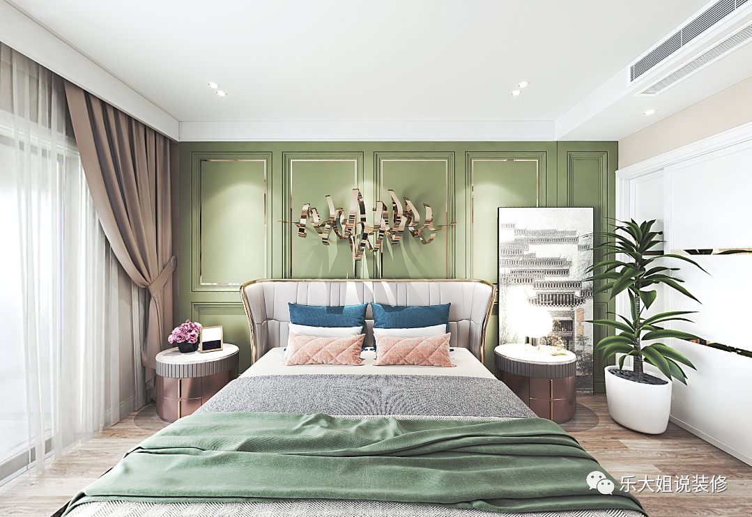 主卧的自然氛围得益于整体软装的搭配,木质地板、淡绿色护墙板的大背景,为整个空间打下清爽、精致的基调,地毯、床尾凳、床头背景装饰品、床头柜、床头灯轻奢感强烈,丰满整片空间,整体色系淡雅,低调而不失华贵。