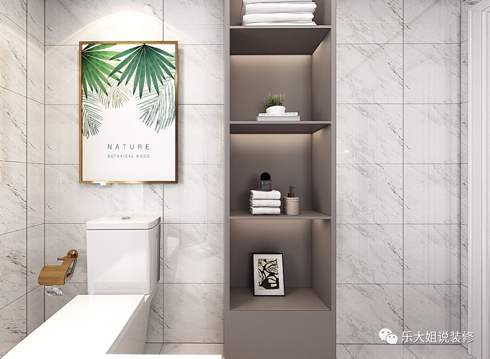 合理利用墙面的收纳空间,灰色壁龛、金属置物架等让各种物件整齐摆放,又可当做小型展示架装饰空间。卫生间都能如此精致,见微知著,更何况生活。